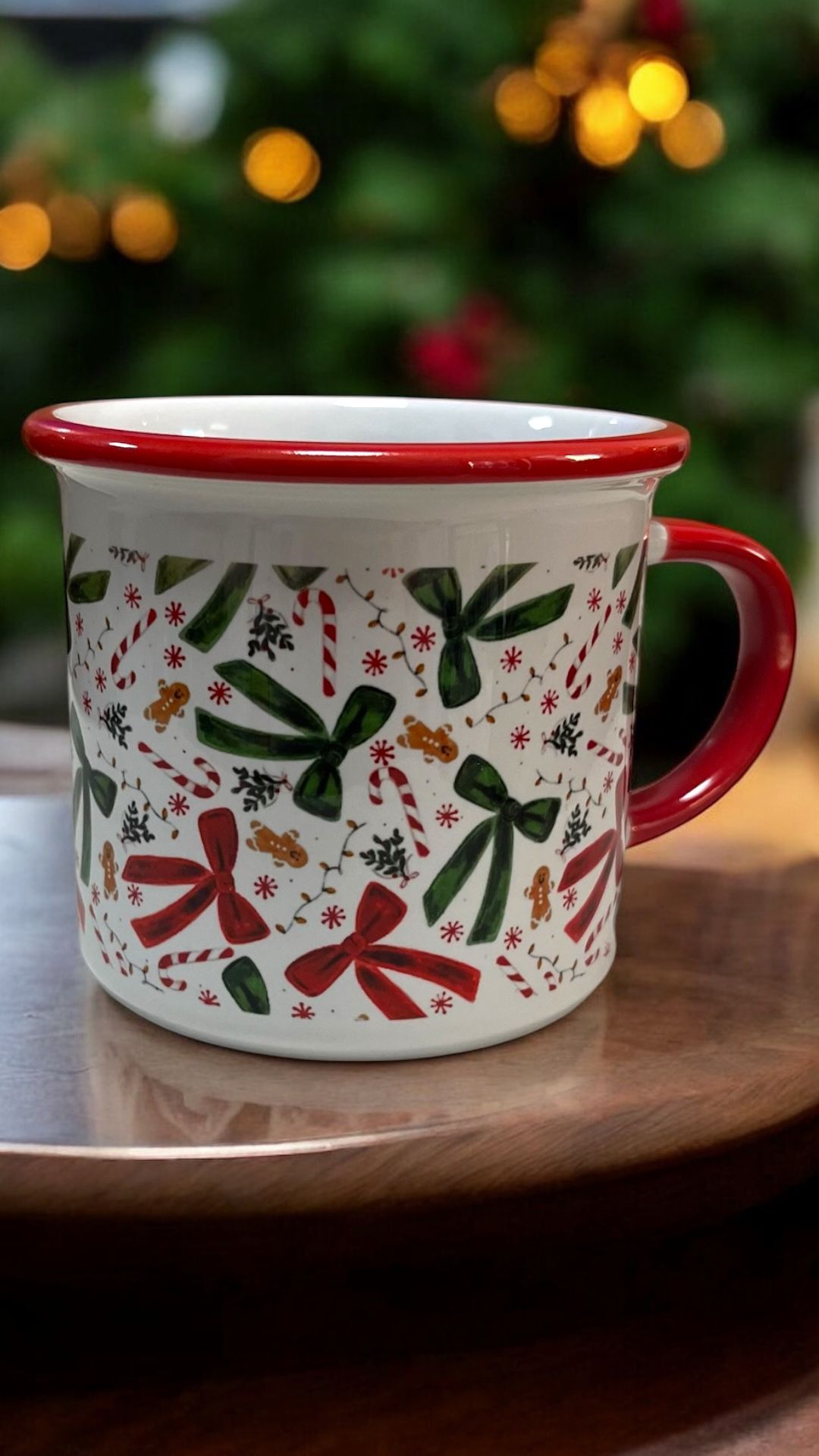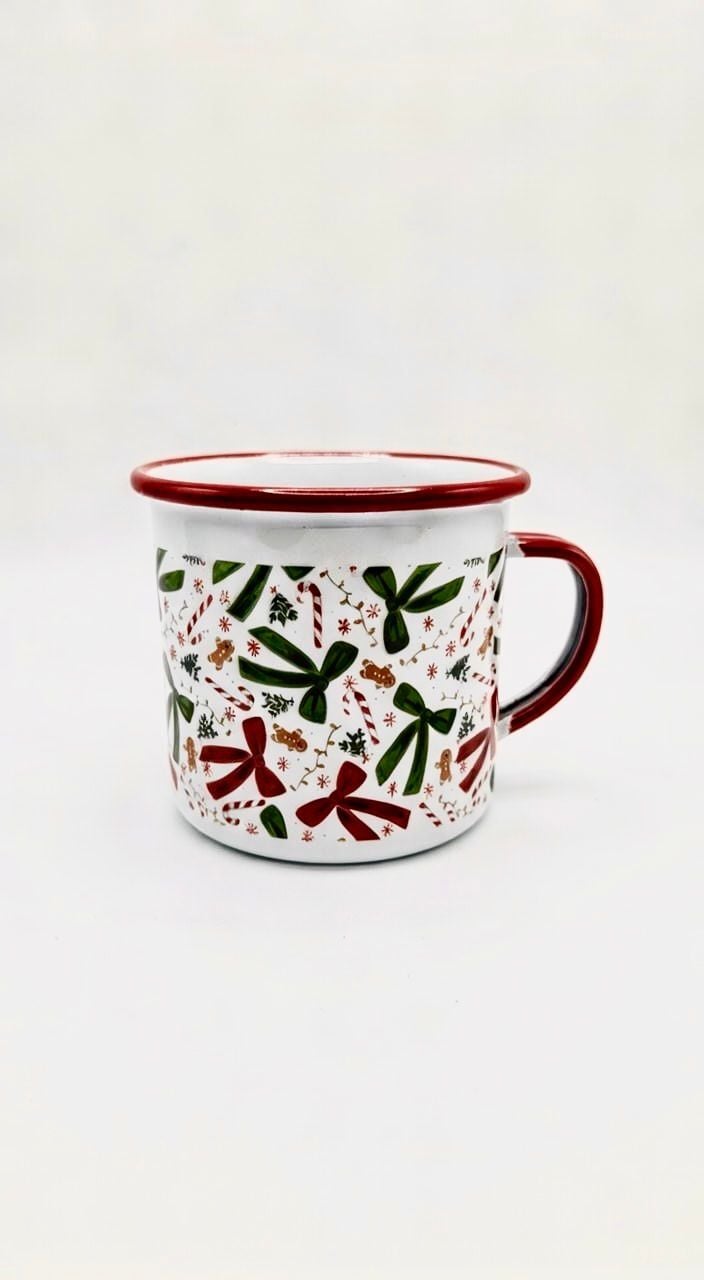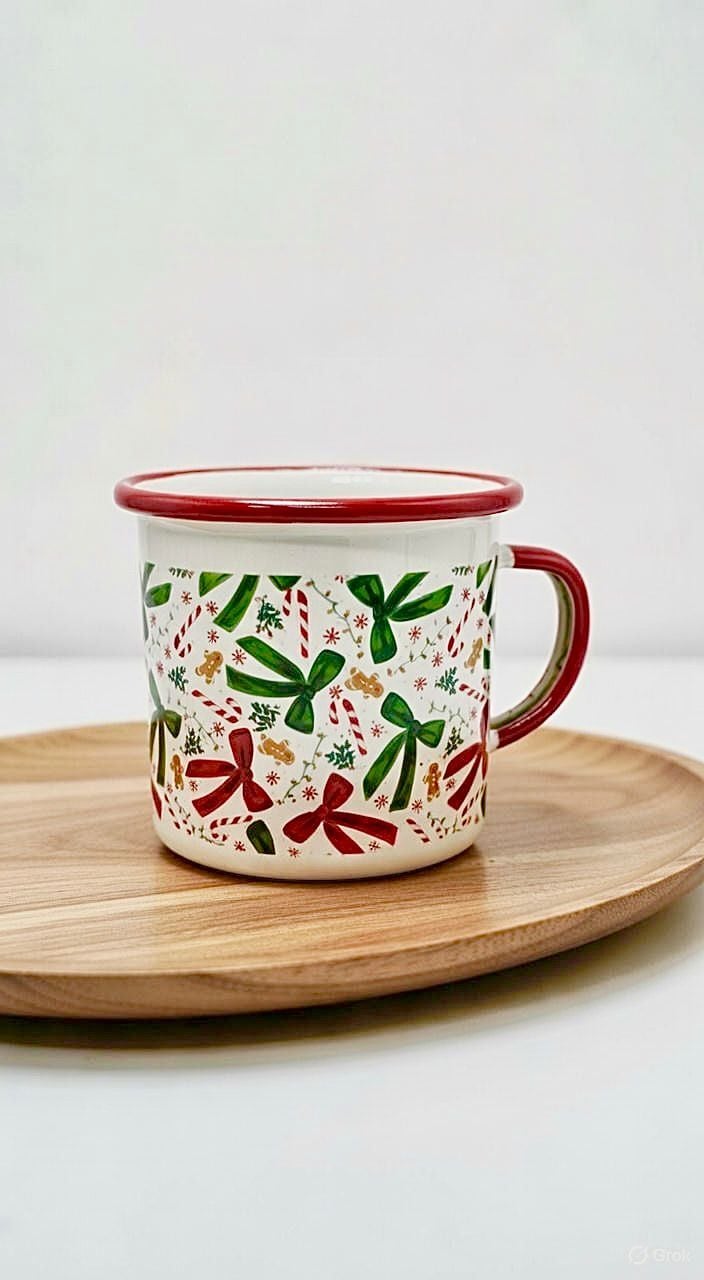 Yeni yılın enerjisini ve neşesini yansıtan yılbaşı desenli porselen kupa, kırmızı ve yeşil tonlardaki kurdele, baston şeker ve yeni yıl figürleriyle özel olarak tasarlanmıştır. Porselen yapısı sayesinde pürüzsüz yüzey, şık görünüm ve konforlu kullanım sunar.